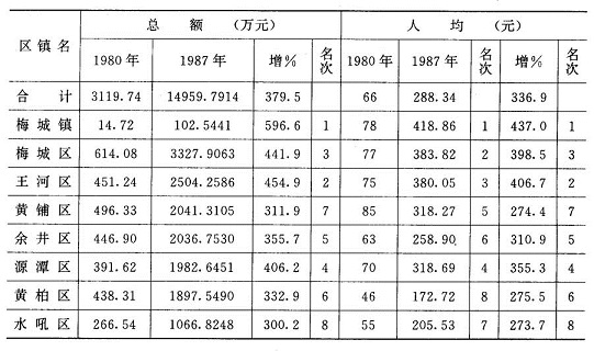 80年代,农业联产承包责任制普遍推行后,随着政策的开放,农民家庭副业逐步兴旺起来。各种类型的专业户、重点户也大量涌现。1983年是建国以来我县农民年人均纯收入首次超百元之年(117元)。此后4年,农民年人均收入都在250元以上,其中,1984年达301元。1987年为288.3元,较之1981年的人均66元净增3倍多。然而,与同一年份的非农人口人均收入相比较,还低50%多,而且,不同地区间的差别也较大。梅城镇和梅城、油坝、王河3乡,年人均收入都在400元以上,其中,梅城乡最高,为478元;而后冲、水贵、官庄、大水、彭河、塔畈、黄柏、槎水、龙潭、杜埠10乡,则都在150多元至180多元之间,其中大水、后冲两乡最低,分别为156元、157元。是年,全县列入扶贫对象(人均收入在200元以下)的有32346户,150181人。分别占当年农业总户数的28.6%和农业总人口的30.9%。