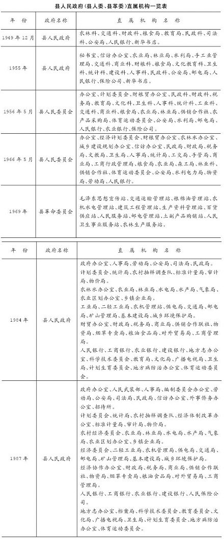 据1949年12月统计,县人民政府设置直属机构10个。随着各项事业的发展,到1955年县人民政府直属机构增至21个。