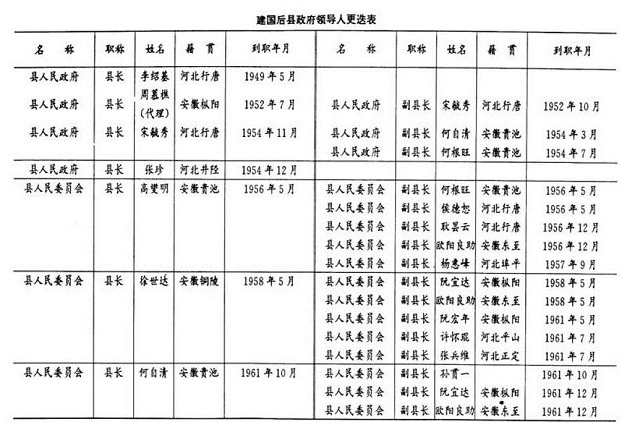 1949年5月1日,贵池县人民政府成立,县长由上级委派。1952年10月始设副县长。