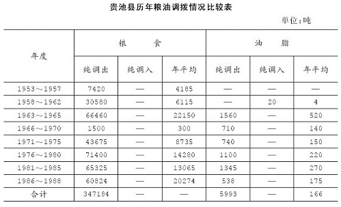 调运量建国前,本县粮油运输均由私商分散进行,无法统计运量。建国后,贵池购入的粮油,除保证县内人民食用,绝大部分年度都是“纯调出”(即调出县外大于县外调入)。从1953年至1988年,纯调出粮食347184吨,年平均8810吨。1963年至1988年,纯调出油脂5993吨,年平均230吨。1979年,纯调出粮食高达2446万公斤。1985年,又增至3192万公斤。按全县36年中平均农业人口推算,本县每一农业人口在36中,年平均向外县提供商品粮25公斤。