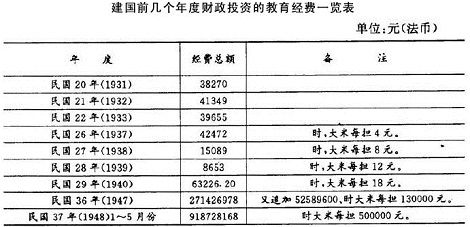 民国时期教育经费的主要来源有以下几项:中央及省拨专款、县赋税附加、县公产学产(款)、教会拨款(限教会私立学校)以及私人捐助等。但因战争频仍,物价飞涨,加上各级当权者对上级拨款层层截留,中饱私囊,实际用于办学极少。下表所列,可见一斑: