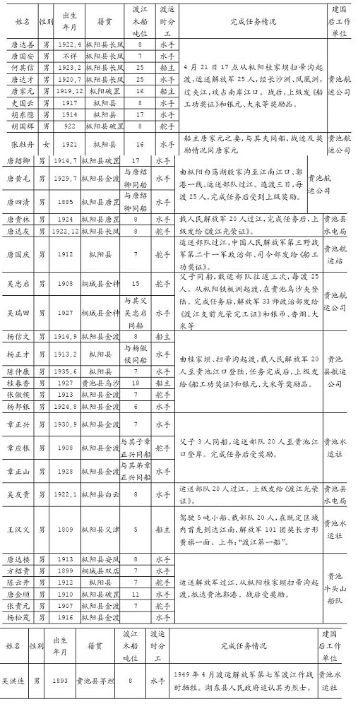 1949年4月渡江战役中,有近2000名船工在枞阳县白荡湖集训,后编入解放军战斗系列,胜利完成渡江作战任务。这些船工大都是枞阳、桐城县人,大军渡江后,除返回原籍的以外,有少数在江南定居,参加社会主义建设。此次修志,通过查阅档案资料和走访知情人,征集到35名在贵池县的船工简明情况。如下表: