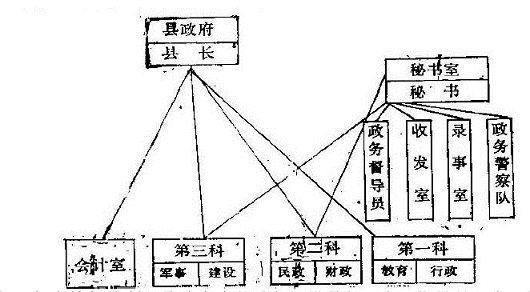 民国21年,县政府裁局设科。民国23年,县政府设有秘书室、会计室及一、二、三科,另配承审员、政务督导员、警佐、督学等职,分理各项事务。