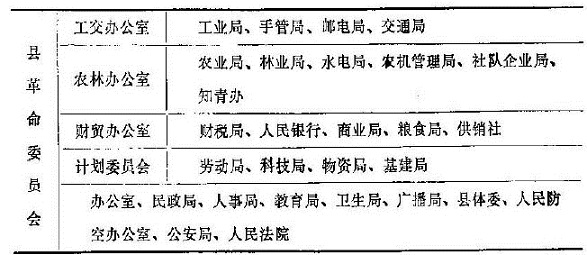 1976年,县革委会撤销办事组、政工组、生产指挥组,设置工交、农林、财贸3个办公室及计划委员会,另设有县革委会办公室及28个局级机构。详见下表: