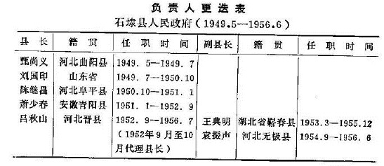 建国初期,区、乡(镇)成立人民政府。区政府设区长、秘书、公安员及民政、财政、粮食、文教、生产助理员,乡(镇)政府设乡(镇)长、秘书、民教办事员、财粮办事员、管理员等人员。时村长或是留用、聘用,或是选举产生。