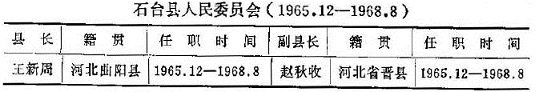 1968年11月,县革命委员会设立办事组、政治工作组、生产指挥组、人民保卫组。原县党政机关及所属21个单位和公检法机构全部撤销。是年12月,县革委常委决定将县直39个单位合并为9个站:毛泽东思想宣传站、人民卫生服务站、粮油棉购销管理站、百货土产品购销站、人民服务站、财税金融管理站、交通邮电管理站、农水技术服务站、林茶生产服务站。石台中学、小河104干校及小河煤矿分别隶属县革委会政工组和生产指挥组领导。