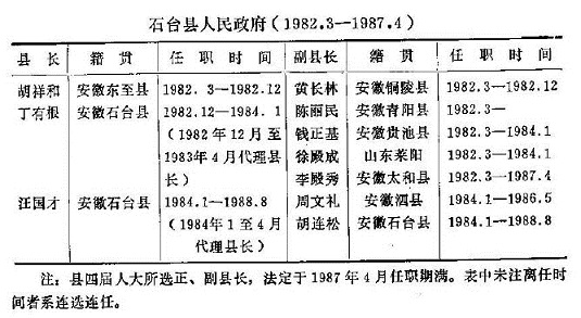 民国38年(1949)5月建立石埭县人民政府,设县长1人。1956年改称县人民委员会,设县长、副县长各1人,委员若干人。1959年3月22日,国务院第86次会议决定撤销石埭县,并入太平县。1965年7月19日,国务院第157次会议批准设立石台县,嗣即建立石台县人民委员会,设县长、副县长各1人,委员若干人。1968年8月8日,县人民委员会被县革命委员会取代,设主任1人,副主任、常委、委员若干人。1982年3月,取消县革命委员会,重建县人民政府,设县长1人,副县长若干人。县人民政府由县长主持全县政务,副县长分管部分政事。遇有重大政事或重要的经济工作,召开县长常务会议研究解决,一般日常工作及阶段性事务则由县长办公会议安排处理。此外,县政府还不定期召开全体会议,由各职能委办局负责人(正职)参加会议,其他局级单位负责人(正职)列席会议,会上听取有关部门的工作汇报,总结前期工作,安排今后政事。