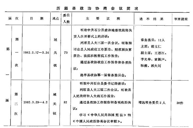 1981年3月开始县人民政治协商会议(简称“政协”)的筹建工作,4月,经中共安徽省委批准,成立中国人民政治协商会议石台县委员会。翌年3月,县政协首届一次会议选举产生常务委员会,设主席1人,副主席及常委若干人。常委会下设办公室及科学技术、文体教卫、对台工作、工商4个工作组。1985年6月,常委会下设机构经调整后除保留办公室外,改设学习、文史资料研究、提案工作3个委员会和科技、文教体、祖国统一、医药卫生、工商、农村经济6个工作组。