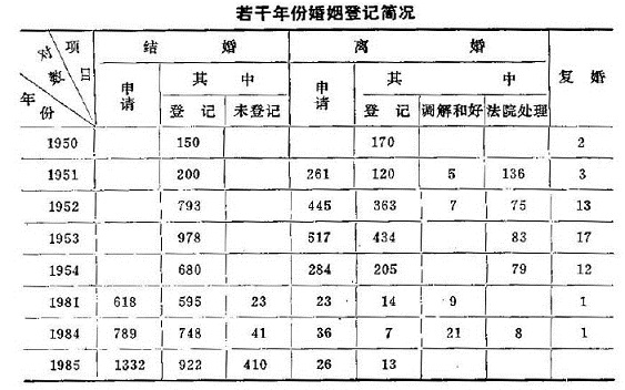 建国初期,县内不少人因过去婚姻不理想,不能自主而有苦难诉,婚姻法实施后,申请离婚和解除婚约者甚多。1950年至1953年,全县登记离婚的夫妇计1087对。同时,很多男女青年自由恋爱,办理结婚登记手续,建立了和睦的家庭,亦有不少童养媳和寡妇挣脱旧婚姻制度的束缚,获得了自由。