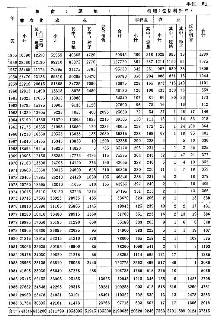 1955年至1988年共销售粮食219063.6万公斤,油脂(包括料折油)3731.5万公斤。