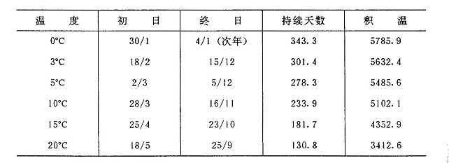 通过各界线温度并有80%保证率的日期、天数、积温一览表