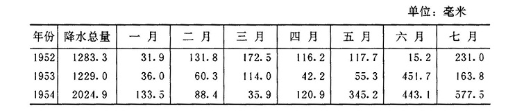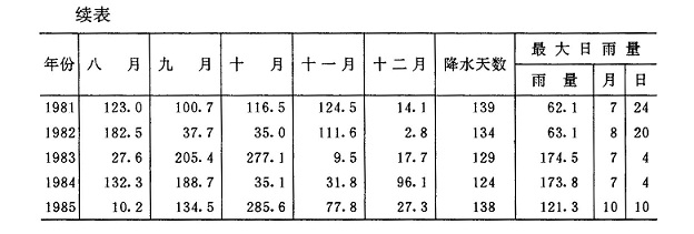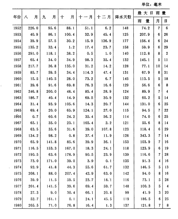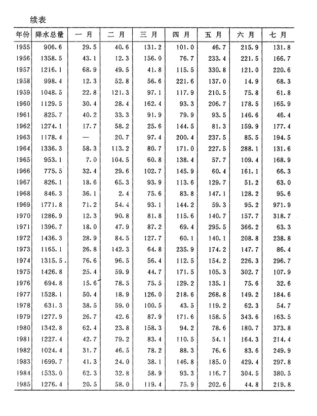 常年月降水量的分布以7月最多,6月次多,12月最少,1月次少。月最大降水量为971.9毫米,出现在1969年7月。月降水日数以4月最多,年平均为14天,12月最少为8天。本县最长连续降水日数为14天,出现在1963年8月15~28日和1970年9月7——20日,分别降水158.8毫米和93.6毫米。最长连续无降水日数为41天,出现在1973年11月9日——12月19日。1966年8月只降水0.7毫米,1979年10月只降水0.1毫米。平均每年日降水量在100毫米及以上的共有22天,平均十年八遇;日最大降水量为343,3毫米,出现在1969年7月14日。1小时最大降水量为80.6毫米,出现在1984年7月4日。10分钟内最大降水量为27.0毫米,出现在1976年5月18日零点55分。1969年7月14日~17日连续暴雨4天,降水717毫米;当年7月13日22时26分至15日12时零分,计37小时34分内一次连续最大降水量达494.1毫米。1969年2月16日至22日雨淞时数达170小时15分钟。