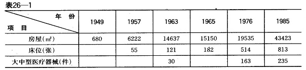 1951年,县卫生院仅有病床床位1张,1985年,全县共有床位813张,平均每千人1.57张,平均每张病床建筑面积为57.1平方米,其中县医院、区、乡(镇)卫生院分别为38.7、55.1和76.2平方米。