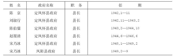 民国37年1月,定凤怀县政府无工作机构,设县长1人,县长以下只有定凤怀县总队。总队设总队长、政委、副总队长各1人。