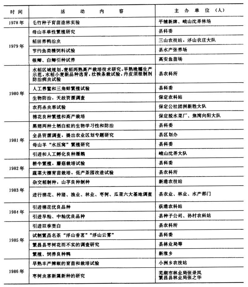 【科技培训】1983年,县科协举办养鸡训练班两期,培训乡村养鸡技术员70人;县科委从厂矿选送两名技术人员学习微电脑技术;县农业局举办农民技术员训练班,学员200多人,时间一个月。1986年6月,县民政局、科委、科协在已列入国家“星火”计划项目的新淮乡水禽养殖场,为贫困户举办养鸭技术培训班,向圩区40名扶贫对象传授技术;是年为贫困户举办苧麻培训班,民政和科技部门挂钩实行资金、技术、良种配套扶贫;10月,小洲乡团委和农技站联合举办草莓实用技术培训班。黄浒乡根据商品生产和乡村企业发展需要,培训各类技术人材,1984——1986年举办养鱼、养猪、养鸡、养鸭、缝纫、财会、统计、桑树嫁接、麻类种植和良种水稻栽培培训班30多期,参加培训的乡村知识青年1500人次。1986年,平铺乡农技站举办5期农技培训班,受训人数250人次,开展技术服务463人次,召开宣传科技知识广播会78次,印发各类技术资料1800份,从外地引进优良稻种1。37万公斤,采购农药4100公斤,为农民配套服务。