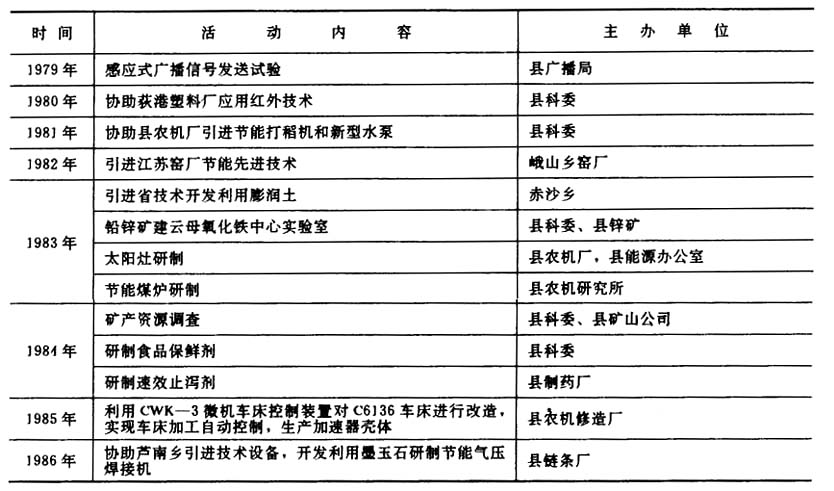 【科普宣传】1981年,专业学会和基层科普协会举办专业性科学技术讲座,宣传普及科技知识,是年县科委和县科协主办的科普宣传活动主要有:组织暑期青少年科技活动,指导制作航海、航空、汽车、坦克模型及其电控、声控、磁控、光控等模型200多种,在县文化馆展出5天,参观人数2500人次;举办航空、航海等模型模拟表演比赛,普及力学、光学、声学、电工学、机械原理和无线电等科技知识。参观人数6000人次;开展科普美术摄影活动,部分作品选送省农业摄影展览、省科技摄影展览和地区科技摄影展览;放映科教电影12场,观众1。48万人次等。1986年,县标准计量所在乡镇宣传标准计量科学知识,检修各种计量仪器2800多件。