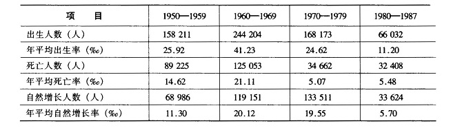 ▲自然变动建国初经过土地改革,促进了生产发展,人民生活逐渐得到改善,加上医疗卫生事业的不断发展,人口增长极为明显。50年代出现了第一次生育高峰,年均出生率为25.92‰,其中1954年和1957年的出生率分别高达44.29‰和38.04‰。1959—1960年,由于“左”的错误思想指导,对粮食生产提出高指标,并进行高征购,致使农村社员口粮奇缺,病、饿、逃荒、死亡现象严重,人口锐减12万余人。1960年的自然增长率为-205.8‰。自1961年初开始,国民经济得到正常发展,人民生活逐渐改善,人口出生率回升极快,出现了第二次多年连续生育高峰。1962年至1969年各年人口出生率分别高达57.17‰、49.08‰、46.01‰、48.39‰、44.84‰、45.00‰、45.81‰和45.14‰,其中1962年自然增长率达到47.31‰。70年代推行计划生育以后,人口自然增长得到控制,出生率从1970年的41.5‰,逐年下降到1980年的12.91‰。80年代,由于1962年后生育高峰出生的人口已相继进入婚育时期,出生率又出现高潮,并逐年递增。1987年为13.30‰。据统计,1949年到1987年的38年间,全县共出生647294人,死亡280676人,自然增长366618人。总的趋势是逐步向低出生、低死亡、低增长方面转化。