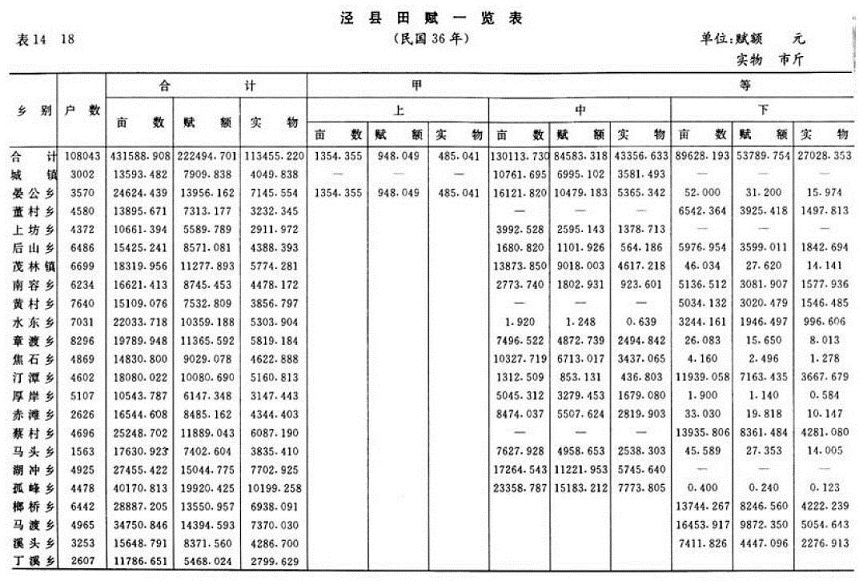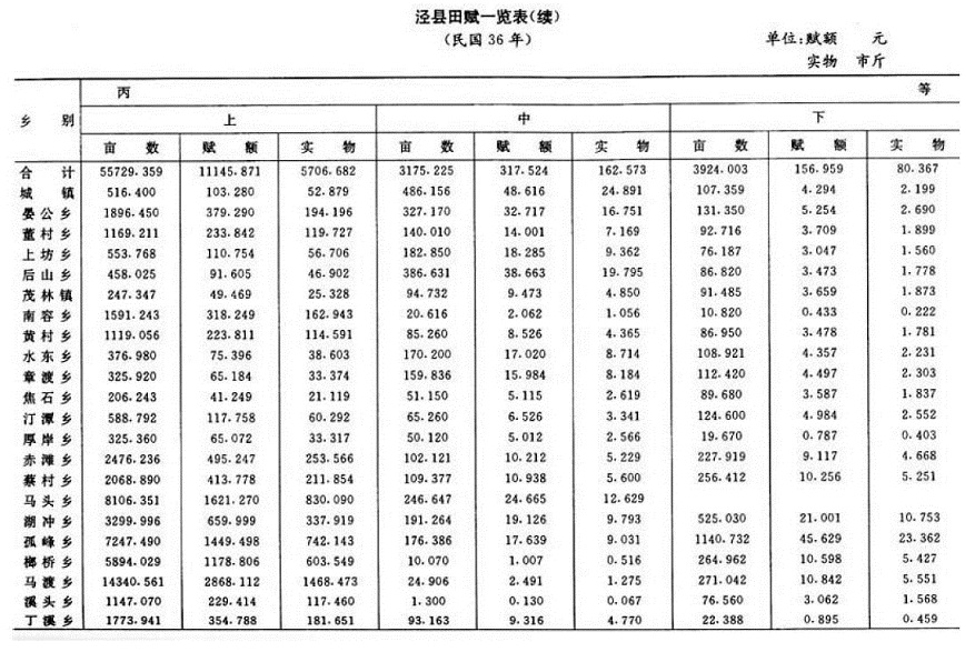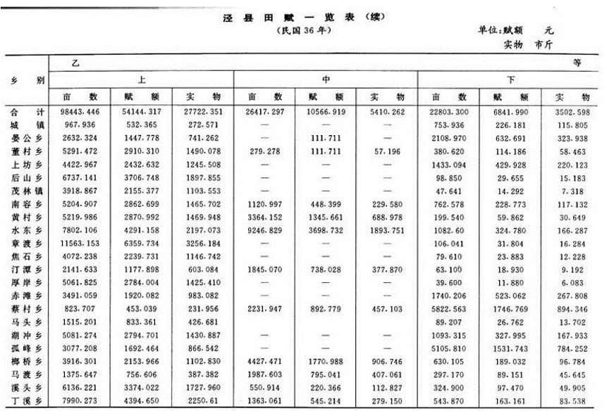 民国初,县署设户房,分东、南、西、北乡4柜为钱粮柜。田赋按清时旧规征收入库。随田赋正额带征“平余”。辛亥革命后,县以“平余”为地方财政收入以供岁支。民国2年(1913)田赋正额及附加开始废银征元,每库平银1两改征银元1.5元;制钱1千文改征银元8角。民国3年,“平余”提归省有。民国4年,实行按田赋正额加征15%,谓之“一五加征”。5月,改按每亩科征的正耗、正杂、平余、加捐合并总额加征15%。民国18年本县遵省府规定,对旧时地丁、漕米等名目一律删除,原正附赋额不增不减,合并计算,统称田赋,直接按亩科征银币。经过裁并,泾县每亩赋额征银0.3299元,征额如前,不增不减。民国30年,改钱粮柜为“泾县田赋实物经征所”,在章渡、潘村营、榔桥设分所。民国32年后改为田赋粮食管理处,下为分处,田赋改征实物,每元赋额征稻谷2斗或小麦1.5斗。翌年升为每元折征稻谷4斗或小麦2.8斗。同年又以低价随田赋征购军粮。购粮款部分付给现金,大部结付“粮食库券”或“法币储蓄券”,长时间不予兑现。民国31年(1942)7月起,全县开展“土地陈报”,实地测绘丘段地形,查明地籍。次年按“陈报”改定土地科则,分三等六则制订新税率,赋额总数比“土地陈报”前增68.32%。民国32年实行“征购公粮”,结付交粮户“粮食库券”,不付现金,实为摊派。民国33年(1944)对“近敌区”(即指革命根据地周围)之赋谷,折款售给交粮户,以未征起者为限。售价按财政部规定每石350元,本县再按折款交粮数,向完粮户加派“自卫乐捐”。当年全县出售“近敌区”赋谷7391177石,收售价258.7万元(法币,下同),加收“自卫乐捐”266.8万元。民国36年(1947)全县纳粮土地分为甲、乙、丙三等。每等分上、中、下三级,每亩赋额最高7角,最低4分。全县田赋额基数为222494.7元。与民国32年的总额2227211元接近;平均亩征币0.52元,比民国17年亩征0.3299元增长57.16%。