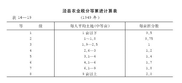 解放后,废田赋制度,改征农业税,简称公粮。1949年实行“按亩累进计征”,以行政村为单位,经民主评议,按当地中等田亩产确定村内“中等亩”。再按每户土地出租、自耕、佃耕之农业收入计算出该户人均占有“中等亩”数和负担分数,以此作为累进计征的依据。
