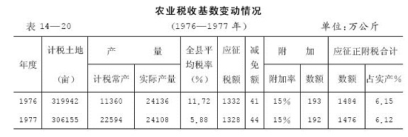 1950年3至9月,在全县开展“查实田亩,评定产量”的土地整理工作。按照中央制订之《新解放区农业税暂行条例》和《皖南区1950年农业税暂行条例施行细则》,本县农业税实行以户为单位,按农业人口每人平均农业收入累进计征。自耕、佃耕或出租土地的农业收入都按累进税率交纳农业税。每户以人均年农业收入75.5公斤(稻)为起征点,分40个税级确定累进税率。最低税率为3%,最高税率为42%。1951年,全县土地改革完成,农业税收负担政策调整。取消免征点,税级缩减为23个,最低税率为8%,最高税率降为30%;农业税附加由15%改为20%。1952~1957年,泾县执行“晚解放区农业税率”。户人均年农业收入(原粮)75公斤以下免征,75公斤至975公斤以上,分24个税级。最低税率为7%,最高税率为30%。1958年改农业累进税制为比例税制,根据不同经济地区农民实际劳动价值确定不同税率,在适当照顾过去负担水平的基础上,允许不同公社之间税率差别,按照上级规定的控制幅度为22%,最低为9%,随正税所征的地方附加为15%。是年,实征正附税1437.5万公斤,平均税率为15.7%,比1957年高0.83个百分点。1959年始,全县粮食产量大幅度下降,1960~1962年共征农业正税2012.5万公斤,减免税额577.5万公斤,占计征税额28.7%,年平均实征额478.3万公斤,只占1958年征额33.27%。3年免征地方附加。1963至1976年,全县农业税计税常产以公社包产产量为基础,稳定在5750万公斤左右,公粮计征保持在675万公斤上下。1963年地方附加按10%随征,其余各年均按15%征收。1977年调整全县计税常产,并免除基本建设用地及历年水毁沙压耕地的农业税负担。