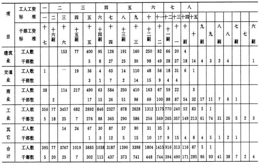 1978年,市有关部门对全市职工工资情况进行了全面调查。这年,全市工人的工资标准有73种(不包括外地调来本市执行外地工资标准的职工),其中实行八(七)级工资制标准的有38种,非八级制有35种。实行八(七)级工资制的工人平均等级全市为3.12级。