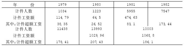 1978年5月后,计件工资制度又有所发展,这年,全市实行计件工资的有3个单位计413人,计件工资总额为22.62万元,其中计件超额工资为6.35万元。从1979年到1985年,全市全民所有制企业实行计件工资情况如下表: