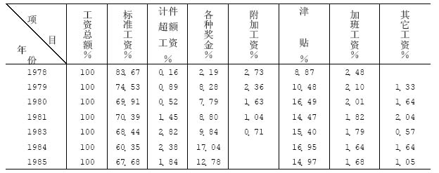 1978年至1985年全民所有制单位全部职工工资总额构成变化情况