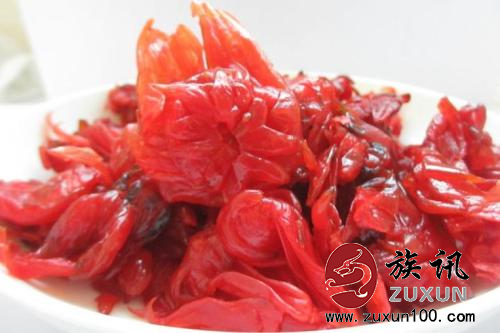 洛神花又名玫瑰茄:洛神花含丰富的营养成分,蛋白质0.3%、醣类0.15%、脂肪0.1%、维他命A、C、铁、钠、苹果酸。洛神花具有解热、抗高血压、有补血,治疗肝病、平衡身体内的酸碱值的效果。可消除疲劳及便秘,并具有利尿、促进新陈代谢的功效。清热解渴,清心降火、止咳、降血压、消除疲劳。富含维生素C,可改善体质。解毒、利尿、去浮肿,促进胆汁分泌来分解体内多余脂肪。味酸,有活血补血、养颜美容的功能。能生津止咳,帮助消化,增强胃功能。洛神花的萃取物,对于预防癌症、冠状动脉硬化、帮助消化以及抗老化、抑制自由基活动有相当的功效;对于帮助女性生理周期也有不错的效果。燥热性虚火上升、高血压有不错的功效,不但可以消暑降火,还可以提神解劳。去子实后新鲜的果萼还含有苹果酸,可以作为果酱、果汁、果冻、茶包、蜜饯及清凉饮料,加糖发酵可以酿酒。