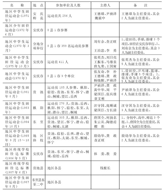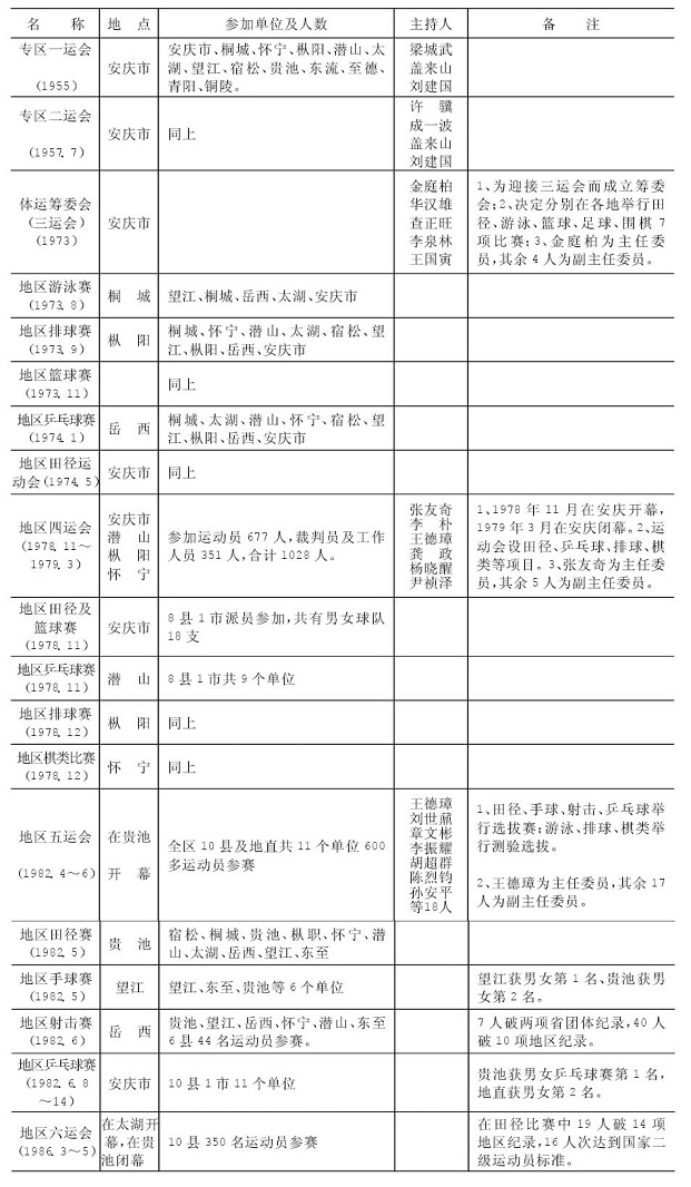 建国后,安庆地区体育运动得到蓬勃发展,自50年代起到80年代中期,先后举办6届地区运动会以及多届球类、田径、棋类的单项比赛。安庆地区还多次承办过省级运动比赛。在历次比赛中,安庆地区运动员均取得较好成绩。