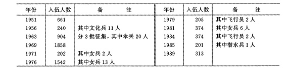 1954年以前,全县仍沿用战争年代的做法,实行志愿兵役制。应征青年的基本条件是:年龄18~30岁,身高不低于1.5米,由区、县人武部统一组织体检和政审,合格者办理入伍手续。