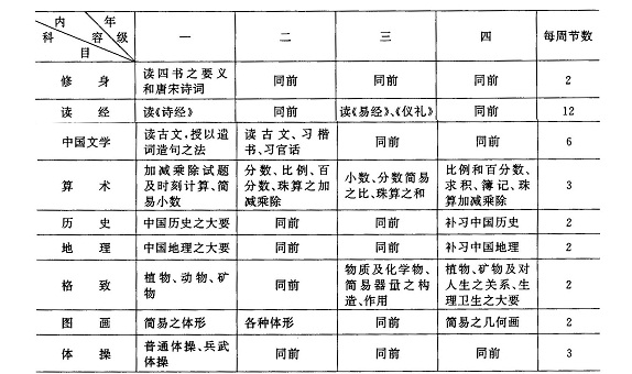光绪二十九年(1903年)桐城县(含今枞、桐两县)初等小学堂授课情况表