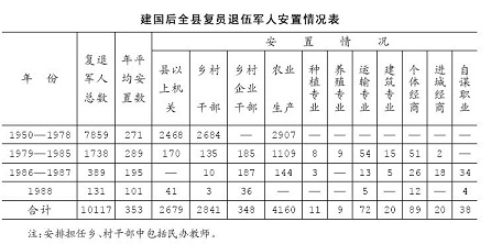 1957年,接收、安置复员军人808名,其中参加农业生产的712人,占88.11%;在机关、企业工作的96人,占11.89%。是年,县转业建设委员会曾先后召开十次会议,研究复员军人的安置。