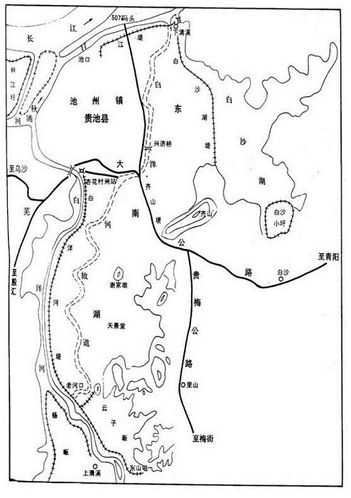 原白洋河道过上清溪后入平天湖(东南湖)贯穿湖心,绕县城南门和东门外,在百牙山附近与白沙河(旧志称横河)相会,于下清溪入秋浦河故道,在江口乡钱家山入注长江。