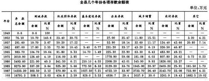 1953年,人民银行以“功在国家,利在自己”为号召,增办储蓄种类,广开储源,使县境储蓄额逐年增长。1987年年末,全县城乡储蓄余额为3733.70万元,占存款总余额的比重由1978年的6.7%上升至26.4%。是年,各银行(局)储蓄余额分别是:县工商银行2803.40万元,占75.06%;县农业银行830.00万元,占22.22%;县邮电局73.46万元,占1.95%;县建设银行28.03万元,占0.77%。