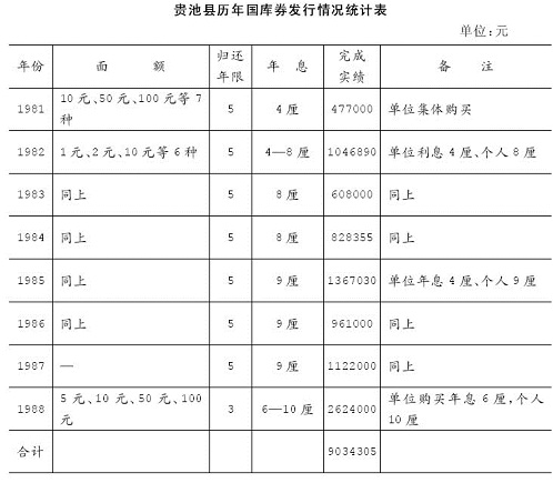 国库券本县发行国库券始于1981年。8年中(1981—1988年),全县发行国库券1066.3万元。其中1984年上级分配任务79.6万元,完成82.8万元,荣获安徽省人民政府颁发的“国库券推销工作先进县”奖匾。以后除1985年因任务加大一倍未完成外,1986、1987、1988连续三年均超额完成上级分配任务。