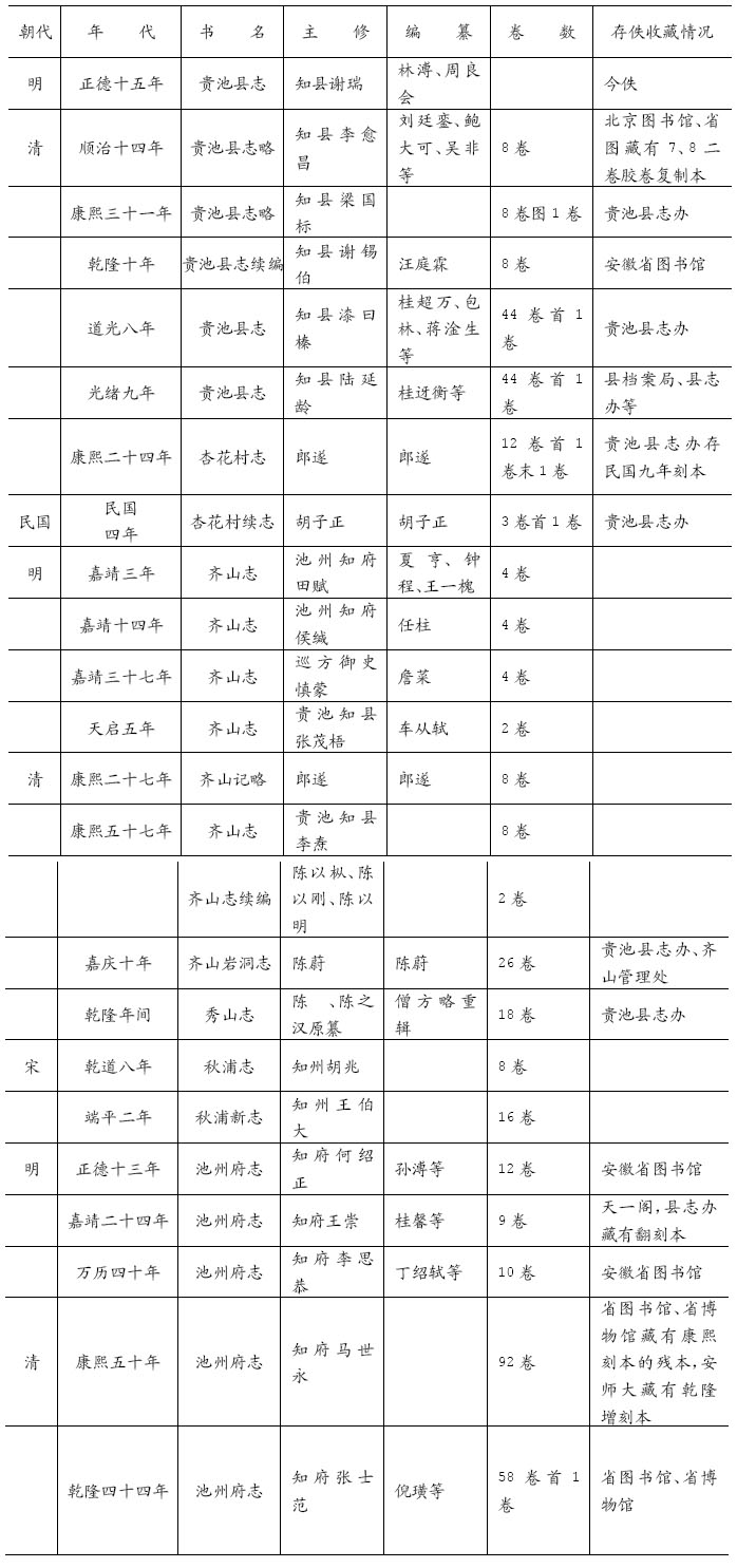 贵池古秋浦邑,昔贤以循良著闻者载在邑志,代有其人。余于庚午岁承之兹土,兢兢焉。求所以称民社之责者,茫无据也。邑附郡为首县,得日夕太府大人之前奉教指南。稍免陨越,公余取县志旧本若干卷翻阅之,念此乡湖山秀丽,人物蔚起,征文考献,不患无实。而简编残脱十存其半,盖从章皇帝丁酉以迄于今三十余年,一世矣而放失若此,抑何以备轩之使过而采风问俗为耶。县官知一县之事,掌故应存,莫此为急。于是就图籍之缺者补、伪者校、残者整。版初隘。今大之,视昔之裒集者无敢删也,其有关政教者无敢遗也。凡见闻为前之未逮者,不敢不博采也。野史家乘不敢不旁搜也。篇目仍其旧,隶事从其新。通古今之变,具得失之林,故观乎舆地,知险要而地道可因矣,观乎风土,知奢俭而民政可平矣;观乎赋役,知供用而财求可阜矣;观乎官制,知张弛而补救可施矣;观乎选举,知用才而民志可立矣;观乎人物,知辨等而民治可久矣。且武城有弦歌,子产有辞令,仕优则学,润色皇猷,故以艺文终焉。若夫志以继史,而史氏三长昌黎公犹逊谢弗居,予又何敢胜任乎?抑仍其旧而借手于刘氏之拾遗。兼询诸学博以共襄告成。而剞劂之费,则捐奉从事、不问之里民以滋扰云。康熙壬申。