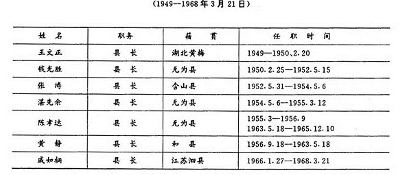 1958年人事科和县委组织部合署办公,监察室与县委监察委员会合署办公,农业科改农业局,财政科与税务局合并为财政局,供销合作社并入商业局,文教科改称文教局。1958年12月15日,和县、含山合并为和含县。