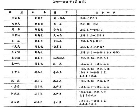 1949年2月,含山县民主政府改称含山县人民政府。下设秘书室、民政科、文教科、司法科、建设科、工商局、公安局、邮局、金库。