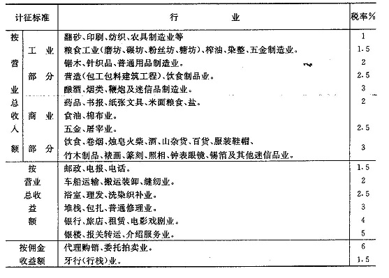 解放初,暂延用旧制税率按不同行业定为0.5%至4%。1950年1月,政务院公布《工商税暂行条例》,营业税即为工商业税的组成部分,不再单立税种。本市课税行业及适用税率如下: