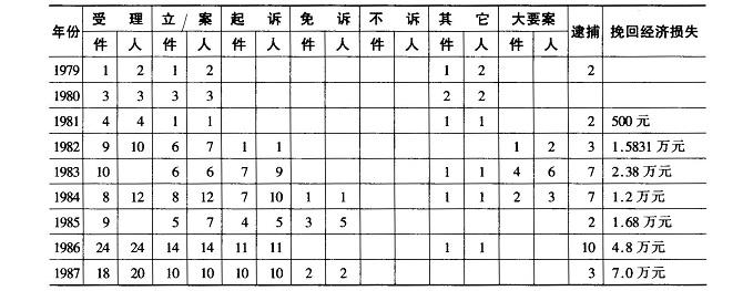 查处经济犯罪案件1954年查处贪污、盗窃国家和集体财产的案件9起,起诉4起,均作了有罪判决。1955年至1956年,试行经济案件的侦查制度,受理自侦案件196件,其中起诉贪污案件17件。1957年侦破贪污案31件,追缴赃款6000多元。其中有19名贪污犯受到法律制裁。1959年立案侦察的贪污案件21起(贪污金额计249000元)批捕了11名贪污犯。1963年共办理经济案件14起,挽回经济损失12600元。1964年至1966年,揭露出贪污、盗窃和投机倒把三种类型案件共计399起(其中万元以上案件15起,千元以上案件100余起)。