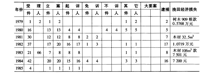 查处盗伐滥伐森林案件1980年,根据中央两院一部关于刑事案件管辖范围的通知精神,把办理破坏森林案件,列为经济检察重点业务。当年就受理滥伐森林案18件,占经济案件的69.2%,立案13件,批捕5人,起诉4件,不起诉4件,作其他处理5件。1981年起对情节严重,构成犯罪的由检察院侦查起诉;不构成犯罪的,由林业部门、公安机关按照“森林法规”和“治安管理处罚条例”处罚。1985年7月1日起,盗伐森林案件划归公安机关办理。
