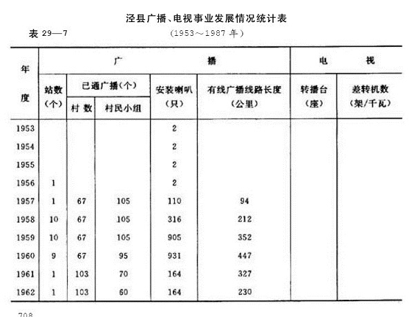 泾县人民广播站1956年3月筹建,翌年1月开机试播,利用电话线作传输线路,安装103只舌簧喇叭和7只高音喇叭,使全县两个直属乡、一个直属镇以及官庄、章渡、孤峰三个区16个乡(当时全县共55个乡镇)能通广播。至1957年底,除赤滩、蔡村、马头3个乡因系长途电话线路未通外,其余乡镇均通广播。其时,已通广播的农业生产合作社67个,占总数的26.5%;生产队105个,占33.5%。全县共安装喇叭306只,其中农村185只,城镇121只。喇叭一般均安装于公共场所或电话机附近。