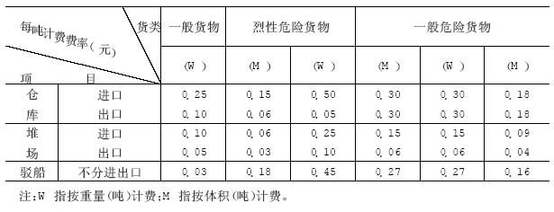货物保管费:按一般货物、烈性危险货物、一般危险货物,分进、出口和仓库、堆场分别收取保管费。