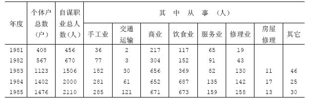 党的十一届三中全会以后,随着个体经济的不断发展,自谋职业人员越来越多。1981年至1985年,全市城镇自谋职业人员情况如下表。