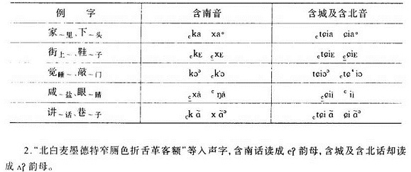 1.含南片较多地保存着将古见系开口二等韵字读成牙喉音声母的情况,含中(也称含城片)与含北片却已腭化为舌面音声母。举例如下: