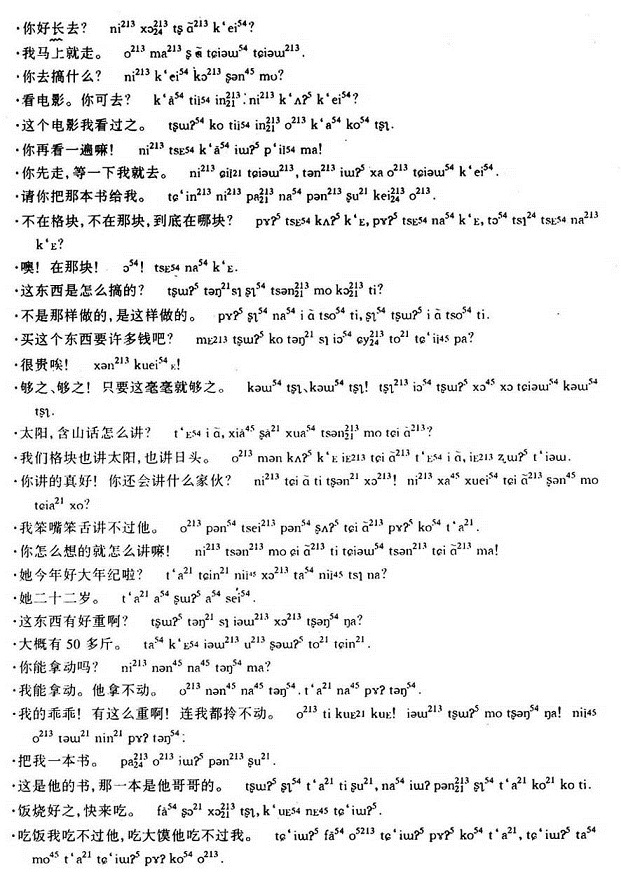 3.含中及含北话将普通话有些读ou韵母的字说成iu韵母。例如:“上楼,拿斗,量豆,碰头,快走”。这些话语中的“楼”、“斗”、“豆”、“头”、“走”等字,含城、含北话都是说成iu韵母,含南话却仍读ou韵母,与普通话读音大体相当。