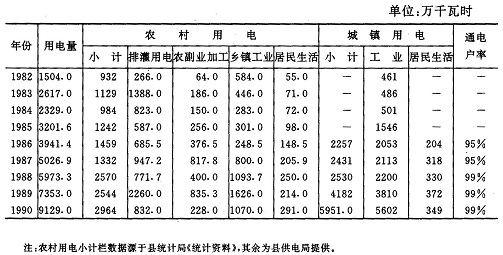 50年代用电量极少,县城关每户用电量15~40千瓦时。1961年后农村逐步通电,1976年实现村村通电,1988年居民用电户达99%。80年代,电风扇、电视机、洗衣机、电冰箱等电器产品进入家庭,用电量成倍上升。1990年全县居民生活用电达640万千瓦时,人均用电18.79千瓦时。城关地区户均用电量约达383千瓦时。